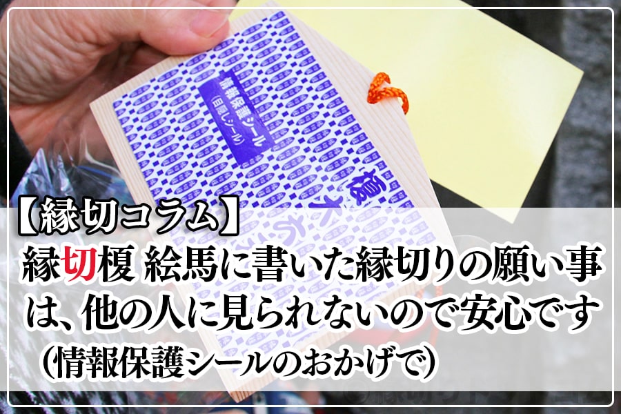※↓こちらの都内で有名な縁切りスポット「縁切榎」では、絵馬の内容を見られないようにするための「情報保護シール」があります。
