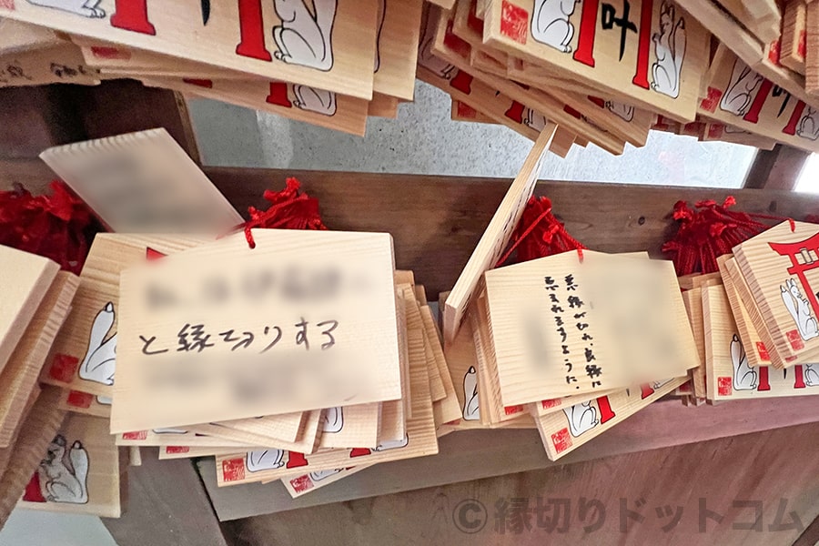 実際の豊川稲荷東京別院の境内で、叶稲荷尊天に掛けられている絵馬は、↑写真のように第三者にも見えてしまう(見られてしまう)形で奉納されており、その中には縁切りの願意のものが見えてしまっている状態のものもあります。