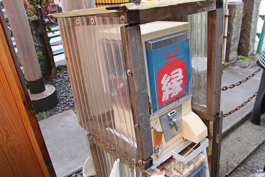 境内外の小道にはおみくじの入ったガチャガチャがあります。縁切りを行った人たちがこちらでおみくじを引く様子も当日は見れました。