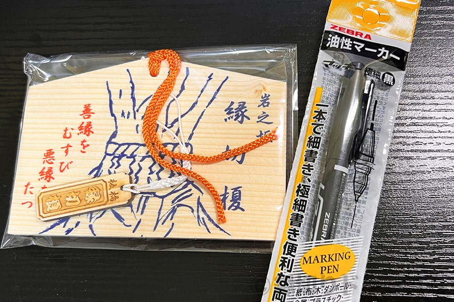 運営者はこのペンを前日に買ってっておいて当日持っていき、実際に縁切榎の絵馬にこのペンで記入をしました。