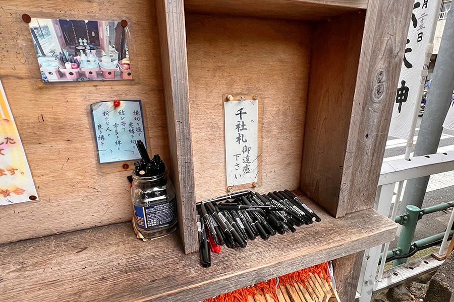 縁切榎に実際に行けばわかりますが、境内の奥、お社の手前にある記入台には、多くの備え付けのペンが置かれています。