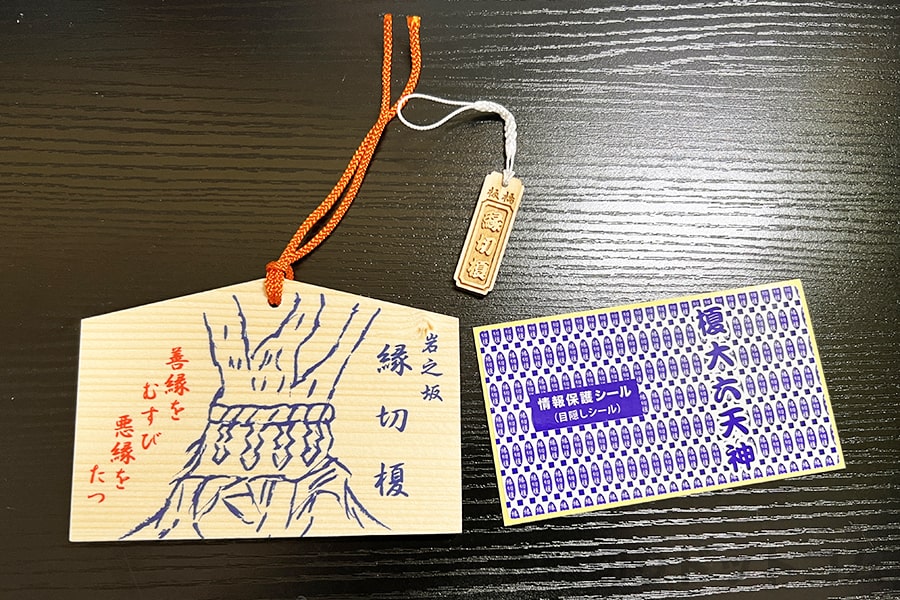 縁切榎では縁切り絵馬は自動販売機で購入(頒布してもらう)することができ、その際この情報保護シールも一緒に同封されて手に入ります。