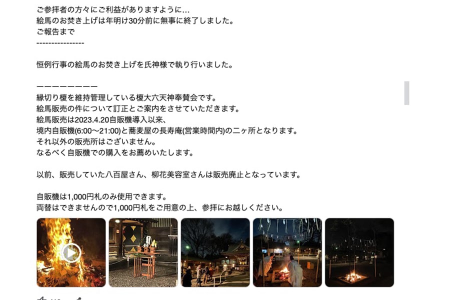 ※縁切榎 奉賛会による絵馬お焚き上げ報告の様子(同奉賛会によるGoogleレビューからのキャプチャー画像を掲載)その2
